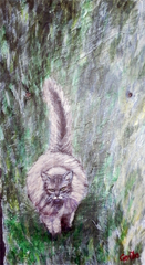 My second slate painting for the fund raiser that my friend Vynnie had at his gallery is of a beautiful farm cat. Jim and I went apple picking and waiting for us was the orchard's mouser. He followed us up and down the fields as we picked apples. In this pose he looked determined with his tail held high, walking at a good pace to keep up. When we stopped to pick he would lie down, keeping an eye on us while at the same time, dozing and relaxing on the gorgeous fall day.