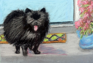 And now it is way past time that I honor her by doing a series of mini paintings of the sweetest Pom ever. This is the first one, Binka on the front porch next to a pot of Begonias. She is the quintessential Pomeranian with her calm and gentle spirit. Although some artists shy away from painting a black animal, I have now had much experience with her coloring and know that there are other colors, besides black, in her fur.